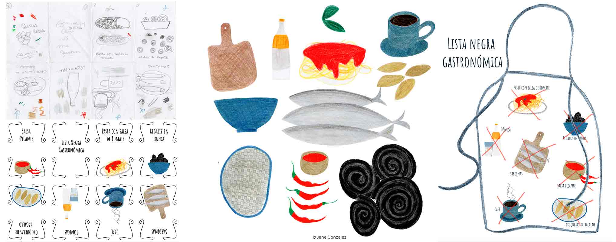 My blacklist of foods and drinks in Spanish, illustrated with colored pencil.