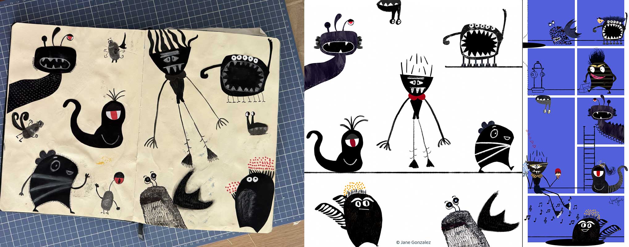 Only when night falls do they appear. They originated from leftover shapes of other cutouts in black cardstock and were digitized to gain a new look in digital collage.