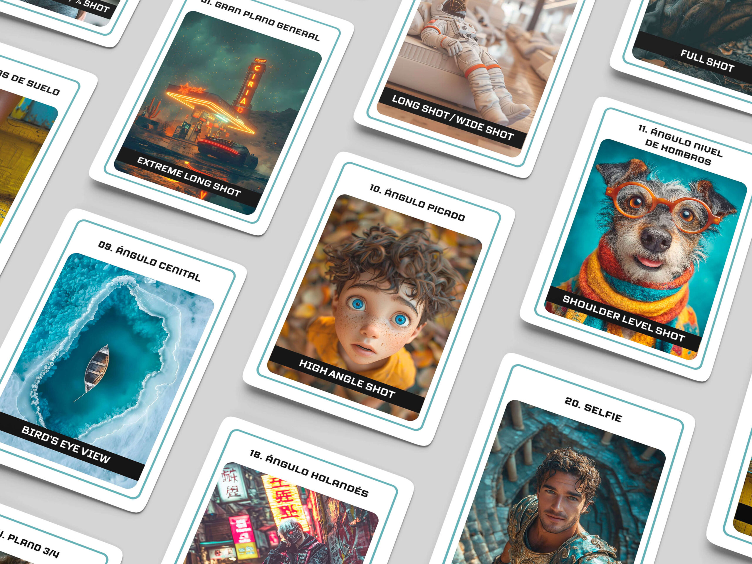 Cada carta traz uma das imagens geradas por IA no Midjourney que aparecem no livro, com o nome do plano ou ângulo em Português e a correspondência em Inglês.